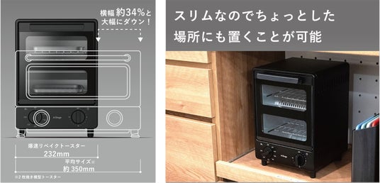 「爆速リベイクトースター」は、当社独自のヒーター技術「トリプルカーボンテクノロジー」により、忙しい朝、なるべく短い時間で、おいしいトーストを食べたい。そんな願いを叶えるオーブントースターです。3本のカーボンヒーターによる上下方向からの遠赤外線加熱で、トースト1枚なら約90秒と素早く焼き上げながら、表面はサクッと、中はふわっとした食感を実現しました。温度調節機を搭載し、リベイクからグリル調理まで、毎日の食事をおいしくサポート。キッチンの省スペースを叶えるスリムな縦型デザインを採用しています。