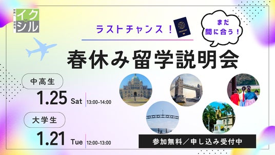 株式会社イクシル(神奈川県川崎市川崎区、代表取締役:伊藤 千佳子、以下当社)は、2025年1月21日(火)・1月25日(土)の2日間、当社主催の「春休み留学説明会」を開催いたします。