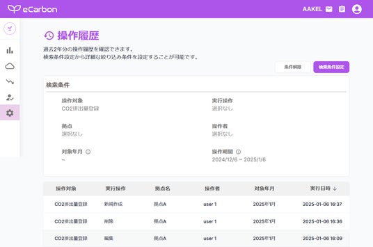 データの入力・編集・削除について、過去2年間の操作履歴を操作者や実行日時とともに確認でき、透明性の高い運用を実現します。拠点や時期、操作者などの条件での検索も可能です。