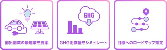 「AAKEL eCarbon」は、GHG排出量の計測・可視化だけでなく、排出削減目標を達成するための具体的なアクションをご提案するサービスです。基準年度、目標達成年度、削減目標、設備データなどの必要なデータを入力すると、事業所設備の「電化」「効率化」、使用電力の「再エネ化」、削減しきれない排出の「カーボン・オフセット」の中から、最適化アルゴリズムにより最も効果的な組み合わせを自動でご提案します。