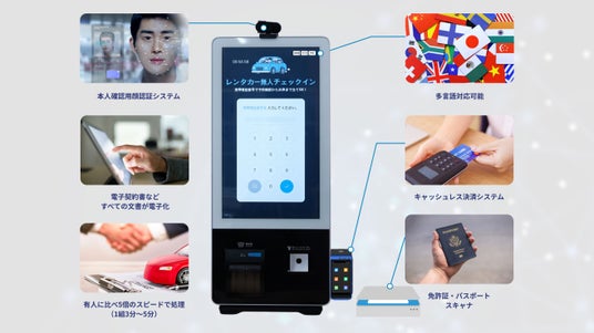 キオスク端末では、予約情報の確認、免許証スキャン、キャッシュレス決済まで、受付に係る手続きを最短3~5分でレンタカー利用客がセルフで行うことが可能です。また「顔認証機能を搭載しており、非対面での本人確認が可能なため、レンタカー利用客はよりスムーズにチェックインできる点が特徴です。