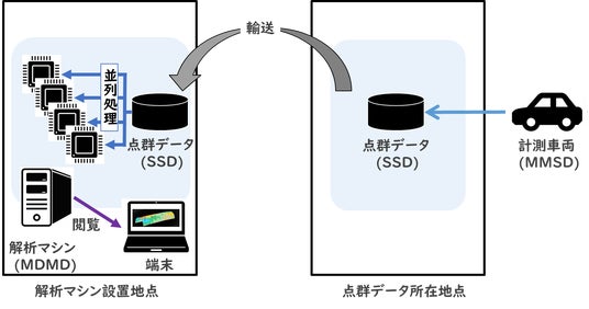 我が国の社会インフラは高度経済成長期に集中的に整備され、その多くが今後急速に老朽化することが懸念されています。2020年からの20年間で、建設後50年以上経過する施設の割合は加速度的に増加し、特に道路・橋梁においては、約7割※6を超える見込みです。このため、インフラを計画的かつ効率的に維持し、必要に応じて更新することが求められています。安全なインフラ維持の実現に向けて、三菱電機はMMSDやMDMDによるトンネル等のインフラ点検を支援する計測および解析サービスを提供し、NTT東日本はMMS※7を利用した電柱点検を行うなど、両社は点群データを活用したインフラ維持管理に関する取り組みを進めています。しかし、点群データはデータの容量が非常に大きく、一般的なPC等では限られた範囲しか解析できないため、高性能な解析マシンを用いて解析する必要があります。また、従来のインターネット回線を利用したデータの送信や遠隔での解析・閲覧などの作業は困難なため、取得した点群データをSSD※8などに保存し、高性能な解析マシンが設置されている拠点へ物理的に輸送して解析する必要があります。このため、点群データの取得から解析結果を得るまでにタイムラグが生じ、タイムリーな異常個所の確認やデータ不備による再計測の対応が迅速に行えないという課題があります。