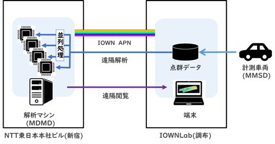本実証では、点群データが保存されているPCを設置したNTTe-City Labo※9内の「IOWN Lab※10」(調布市)と、解析マシンを設置したNTT東日本初台本社ビル(新宿区)の拠点間を、1波長あたり100Gbpsの大容量かつ低遅延、ゆらぎゼロの特長を持つAPNで接続し、点群データの遠隔解析・遠隔閲覧の実証を行いました。