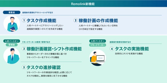 ロボットの遠隔操作業務を実現するクラウドサービス「Remolink(リモリンク)」を提供するリモートロボティクス株式会社(東京都港区、代表取締役社長:田中宏和、以下「リモートロボティクス」)は、Remolinkを導入した事業者がロボットの遠隔操作業務を社外人材へアウトソーシングするために必要となる新たな機能をリリースしました。
