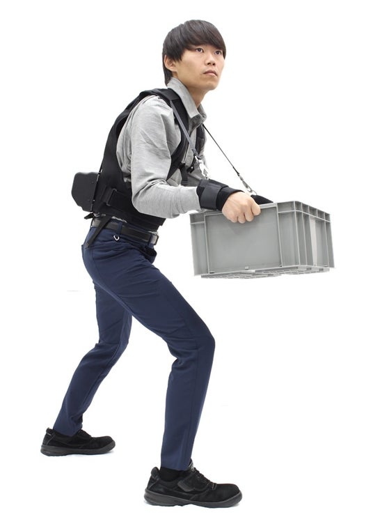 オランダ製アシストスーツのレイボはエネルギー回生システムを利用して前屈姿勢での肩や腰にかかる負担を軽減。パッドには独自開発した素材“EXGEL”を搭載し装着感向上。