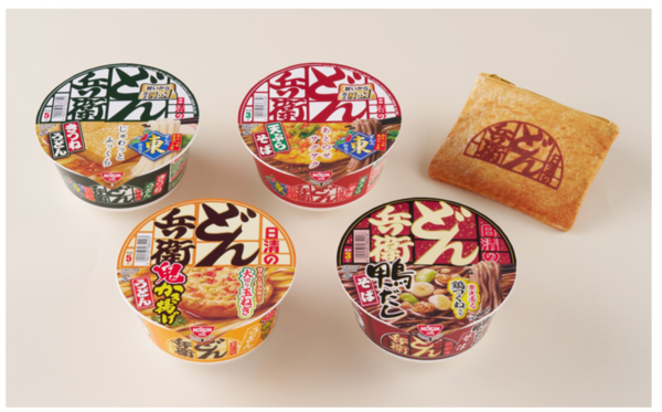▲日清のどん兵衛 お土産グッズ (一人につき1セット) 「きつねうどん」「天ぷらそば」「鬼かき揚げうどん」「鴨だしそば」(各1食、計4食)、「ふっくらおあげポーチ」(1個)
