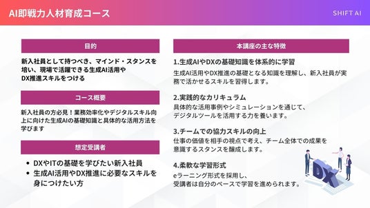 「日本をAI先進国に」を掲げAIのビジネス活用を学べるAI大学「SHIFT AI」を運営する株式会社SHIFT AI(東京都渋谷区、代表取締役 木内翔大、以下 当社 )は、新入社員向けに、DX(デジタルトランスフォーメーション)推進に必要なスキルとマインドセットを学べる法人向け新サービス「新入社員DXコース」を2025年4月1日より提供開始いたします。