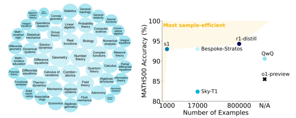 s1kで扱われている質問のジャンル(左)、いくつの設問を学習に使い「競技数学500問」の正答率のLLM別の比較(右)。DeepSeek R1蒸留タイプ(r1-distill)は80万問を用意しているのに対し、s1-32B(s1)は1000問しか用意していないにも関わらず、正答率はほとんど変わらない(「s1: Simple test-time scaling」より )