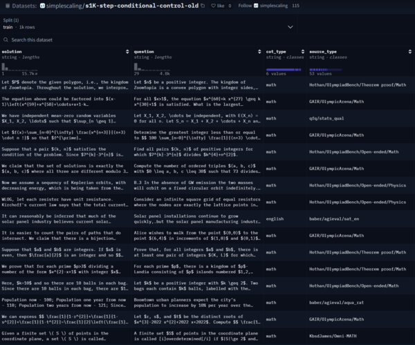 公開されているデータセットs1k。回答(Solution)と質問(Question)、思考過程からなる。各設問はそれぞれ専門知識を問うもので難易度が高く、いくつか読んでみたが、質問自体が何を問われているのかわからない難しさ