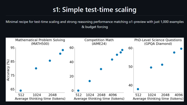 トークン数が増えていくに従って、正答率が上がっている。左から「数学問題」、「競技数学」、「博士課程レベルの質問」。100トークンは英文約300字、日本語で約120字(「s1: Simple test-time scaling」より )