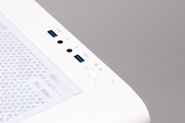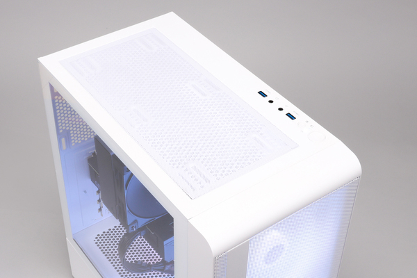 ケースは、標準だとAntecの「P20C」だが、試用機はThermaltakeのミドルタワー「S200 TG ARGB ホワイト」が採用されていた。サイズはおよそ幅210×奥行395.3×高さ460mmと比較的コンパクト。左側面のサイドパネルは、厚さ3mmの強化ガラス製で、内部の視認性も良好だ。