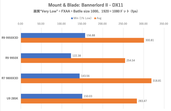 Mount & Blade II: Bannerlordでは画質「Very Low」、アンチエイリアスはFXAAとし、Combat Size(戦場内に描画する兵士の数)は最大の1000に設定。ゲーム内ベンチマーク再生時のフレームレートを計測した。