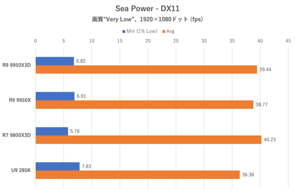 計測開始から間もなく敵方から100発近いミサイルが飛んでくるためCPU負荷もそれなりに高くなる。ただSea Powerの処理の制約か、どのCPUでも40fpsあたりで頭打ちとなった。強いて言えばRyzen 9 9950Xがやや平均フレームレートが落ち込んでいるが、Ryzen 9 9950X3DとRyzen 7 9800X3Dの間に明確な差があるとは言えない結果になった。