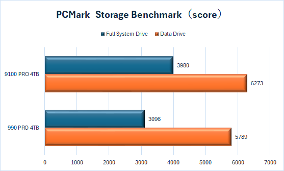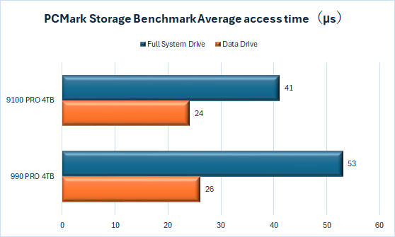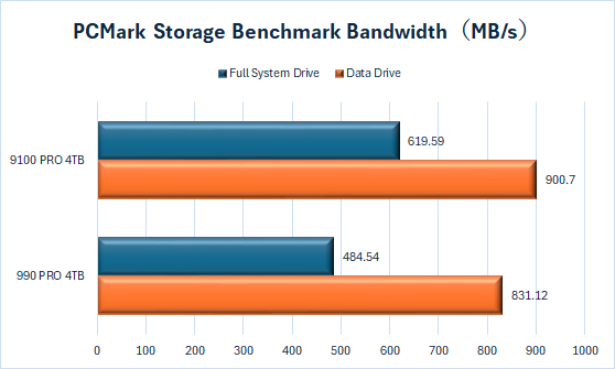 システム、データともに、転送速度のような圧倒的な差とはならなかったが、9100 PROのスコア、帯域幅、アクセスタイムは990 PROよりも、しっかりと伸ばしている。