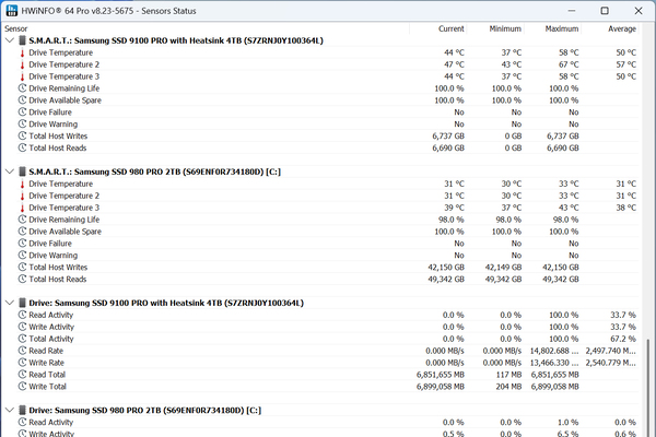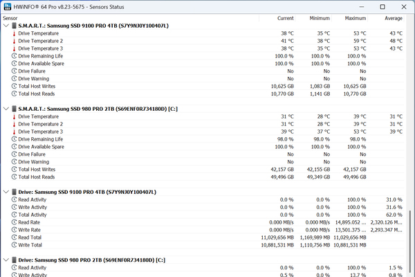 9100 PROは、「HWiNFO64 Pro」上で3つの温度センサーを検出していた。「Drive Temperature 2」はコントローラーと思われ、「Drive Temperature」と、「Drive Temperature 3」はNANDチップで同じ温度となっていた。