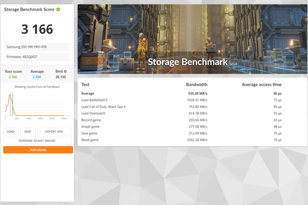 「3DMark:Storage Benchmark」もスコアを伸ばしているが、その差は大きくなく、平均帯域幅(Bandwidth Average)もわずか40MB/秒差となっていた。テストごとの帯域幅とアクセスタイムを確認すると、ゲームのロードとゲームデータの移動では、9100 PROの転送速度が活きているが、「Record game」、「Install game」、「Save game」といったテストでは、残念ながら逆転されている。この点が、総合スコアと平均帯域幅の足を引っ張ってしまった。