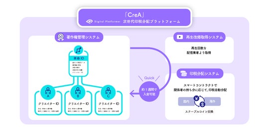 CreAは、再生データと著作権情報に基づき、スマートコントラクトと銀行預金型ステーブルコインを活用することで、印税の分配を即時化・自動化する世界初の取り組みです。従来数ヶ月~1年かかっていた印税支払いを、著作権管理システムと再生回数取得システム、印税分配システムがそれぞれ持つデータを元に、スマートコントラクトで自動化させることにより、最短1週間へと短縮することが可能となります。印税前払い、クリエイター向けレンディングなど、音楽個人を対象にしたサービスから始め、最終的には音楽著作権生態系をデジタル時代に即したグローバルな仕組みにアップデートすることを目指します。
