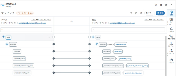 「XMLMap コネクタ」を開いて、連携する項目を以下のようにマッピングします。