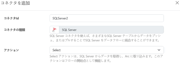 「Selectアクション」の「SQLServer コネクタ」を追加します。