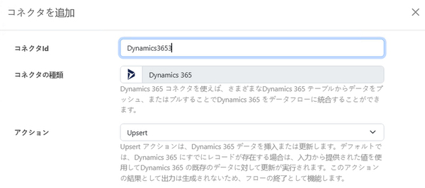 そして「Upsertアクション」の「Dynamics 365 コネクタ」を追加します。