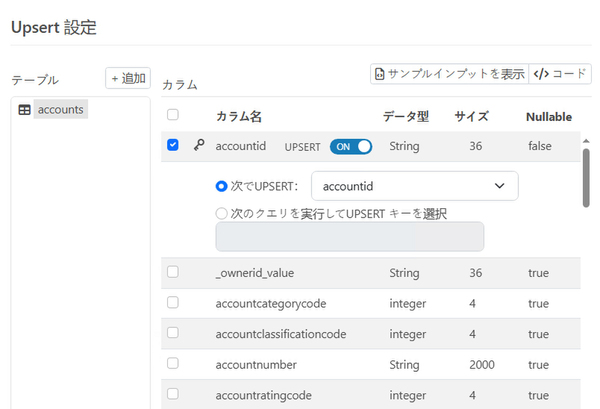 また参照・所有者項目は直接更新出来ませんので、今回は一旦更新する項目以外のチェックを外します(accountidとnameだけにチェックを入れます)。