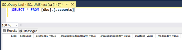 今回はDynamics 365 のaccountsテーブルを対象としたいと思いますので、SQL Server 側には事前に同じ構成のテーブルを用意しました。
