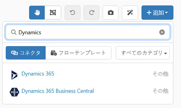 ワークスペースの左上にある「追加」ボタンから「Dynamics 365 コネクタ」を検索して追加します。