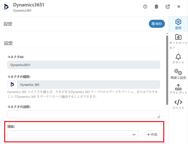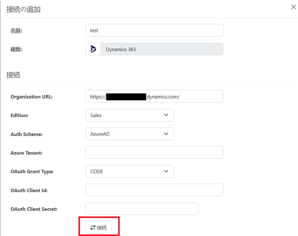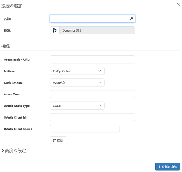 追加された「Dynamics 365 コネクタ」を開き、接続を作成します。