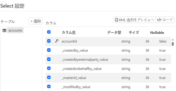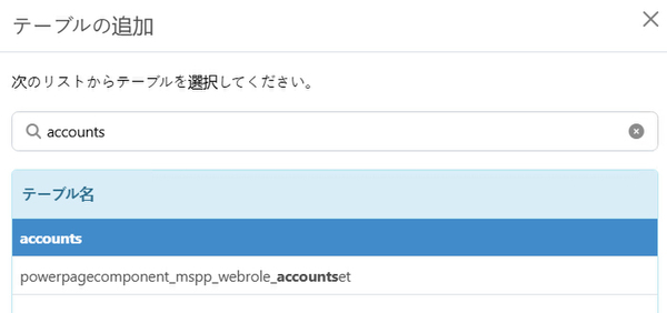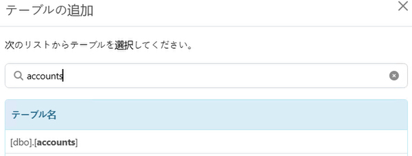 接続設定を追加後はテーブルの追加より、連携先のaccountsテーブルを選択します。