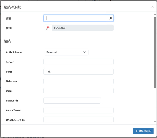 追加された「SQL Server コネクタ」を開き、接続を作成します。接続設定についてはヘルプをご参照ください。