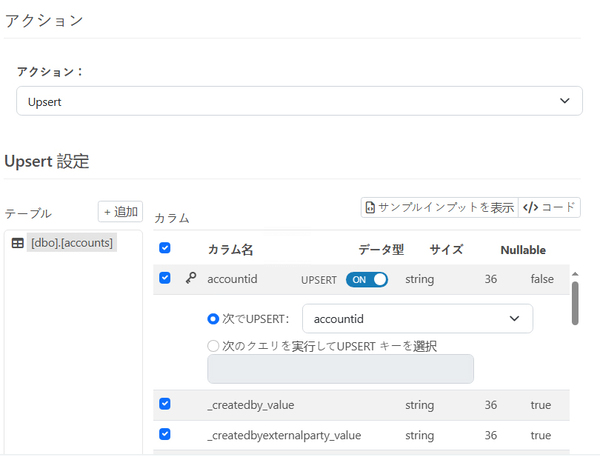 今回は連携先のコネクタとなるため「Upsertアクション」を選択して、コネクタを作成します。