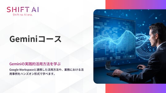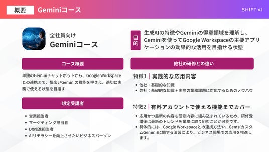 SHIFT AIはこれまで、企業や教育機関向けにAI活用を推進する各種プログラムを提供してきました。その知見をもとに、Geminiの導入と活用を体系的に学べる「Geminiコース」を開発しました。本コースでは、基礎知識から応用事例までを網羅し、受講者が実際の業務や教育現場でGeminiを活用できるスキルを身につけることを目的としています。