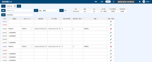 会社詳細に設定した内容で、有休付与、有休消化時間の計算をし、各月の有休残を視覚的に確認することが可能