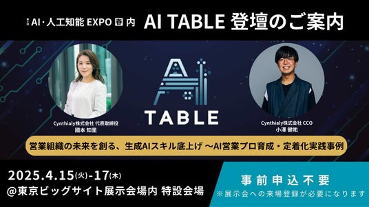 法人向けの生成AI人材育成・導入変革支援を行うCynthialy株式会社(所在地:東京都渋谷区、代表取締役:國本知里、以下Cynthialy)は、AI ・人工知能 EXPOにてAICX協会主催の「AI Table」に、代表の國本・CCO小澤が登壇することをお知らせいたします。