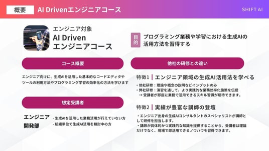 「日本をAI先進国に」を掲げAIのビジネス活用を学べる利用者数No.1※のAI大学「SHIFT AI」を運営する 株式会社SHIFT AI(東京都渋谷区、代表取締役 木内翔大、以下 当社)は、2025年4月14日より、エンジニア向けの包括的オンライン学習コース「AI Drivenエンジニアコース」を新たに提供開始します。本コースでは、企画・設計・開発・テスト・保守など、システム開発の各工程における生成AIの実践的な活用方法を学び、多様な役割に応じた生産性と品質の向上を支援します。
