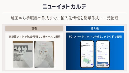 「ニューイットカルテ」は 「ニューイット」における納入先情報の一元管理を行うモジュールです。マップ作成から、選択形式でマニュアルを作る機能を搭載。データベースとして社内外から情報を一括収集する機能もございます。