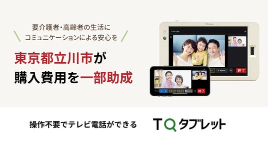 TQコネクト株式会社(本社:東京都渋谷区、代表取締役社長:五木 公明)の提供する、操作不要でテレビ電話ができる「TQタブレット」が、東京都立川市が実施する「高齢者あんしん見守り支援事業」の登録機種に認定されました。これにより、TQタブレットを購入した対象世帯に、機器購入費用に対する8,000円を限度額とした助成金が、立川市より支給されます。