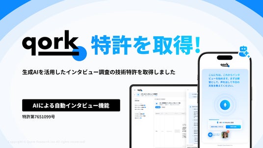 株式会社Quest Research(本社:東京都港区、代表取締役:南健太)は、生成AIを活用したインタビューサービス「qork(コルク)」に関する独自技術で特許を取得したことをお知らせします。