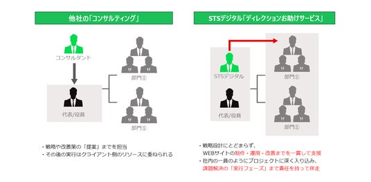 一方で私たちSTSデジタルの「ディレクションお助けサービス」は、戦略設計にとどまらず、WEBサイトやメディアの制作・運用・改善までを一貫して支援。社内の一員のようにプロジェクトに深く入り込み、課題解決の実行フェーズまで責任を持って伴走します。