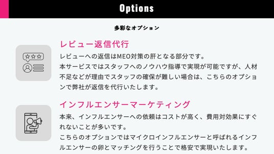 レビュー返信代行、インフルエンサーマーケティングといったオプションもご提案可能です。