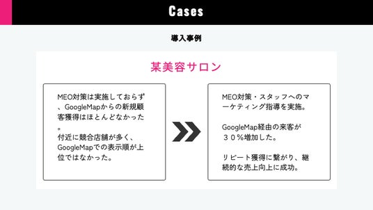 実際に本サービスを導入された美容サロン様では、Google Maps経由での来店客数が 30%増加という顕著な成果を達成されました。さらに、リピート顧客の獲得にも繋がり、継続的な売上向上に大きく貢献しています