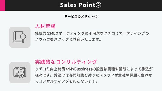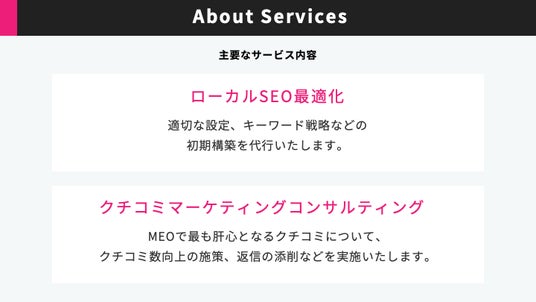 主なサービス内容として、「ローカルSEO最適化」「クチコミマーケティングコンサルティング」を提供します。
