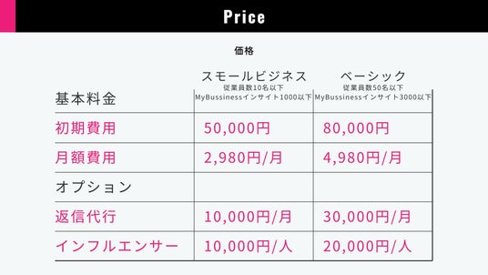 - 初期費用: 50,000円(税込)初期費用に含まれる内容: Googleビジネスプロフィールの取得、貴社サイトやSNSとの連携設定、その他MEO対策に必要な基本設定を行います。