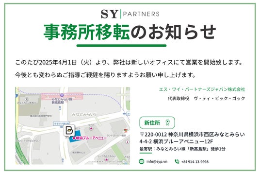 エス・ワイ・パートナーズジャパン株式会社(代表取締役 ヴ・ティ・ビック・ゴック)は、業務拡大につき、2025年4月1日(火)よりより神奈川県横浜市にオフィスを移転致しました。