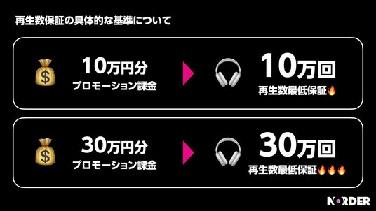 このキャンペーンでは、プランナーと共に設計したプロモーションの成果について、実施前の段階で一定の最低再生数を提示し、それを保証することで、初めてプロモーションに取り組むアーティストにとっての不安やリスク意識を軽減し、効果の最大化を実現します。