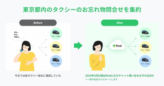 株式会社find(所在地:東京都中央区、代表取締役CEO:高島 彬、以下「find」)が提供する「落とし物クラウドfind」が、一般社団法人 東京ハイヤー・タクシー協会(会長 川鍋一朗/以下「東タク協」)へ導入されます。2025年4月17日(木)より、準備が整った会員事業者から、順次運用を開始します。都内タクシーのおよそ73%(約29,000台)を占める東タク協に導入されることで、今後、より多くのお客さまが一つの窓口で忘れ物の問合わせができる仕組みの構築を進めてまいります。