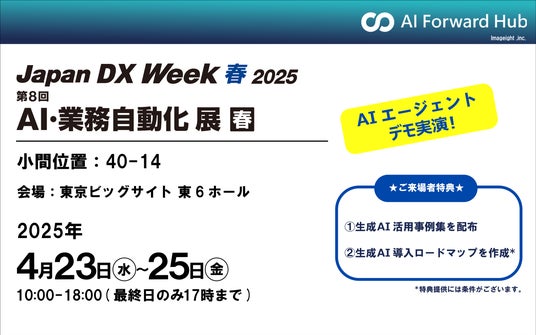 イマジエイト株式会社(本社:東京都渋谷区、代表取締役:津田 幸佑)は、2025年4月23日(水)~25日(金)に東京ビッグサイトで開催される「Japan IT Week 春 2025 第8回 AI・業務自動化展」に「AIフォワードハブ」を出展いたします。