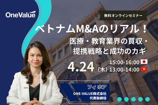 人口増加と経済成長を背景に、医療・教育分野で急成長を遂げるベトナム。今、日本企業の皆様にとって、この市場は計り知れない可能性を秘めています。本ウェビナーでは、ベトナムの医療・教育M&Aに精通した専門家、ONE-VALUE代表のフィホアが、ベトナムの医療・教育業界の動向から、同業界が有望視されている背景、現地の優良案件まで、余すことなく解説します。