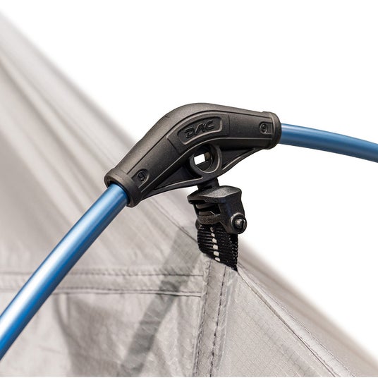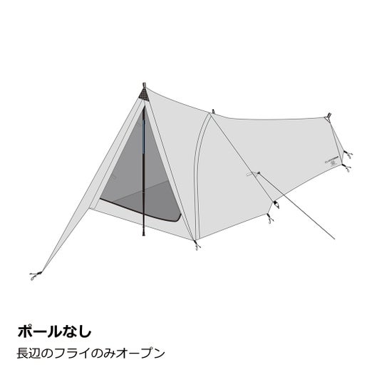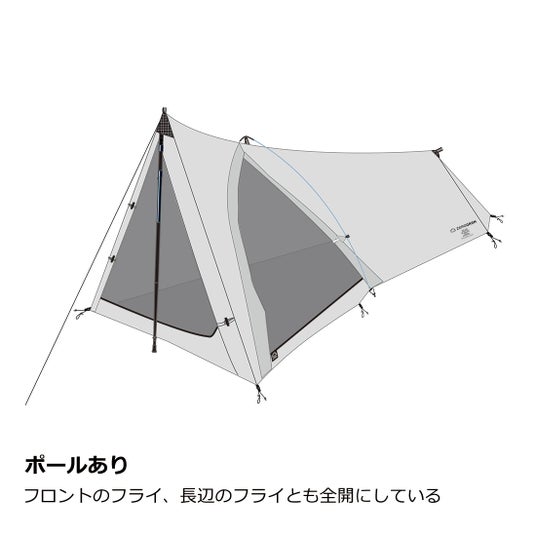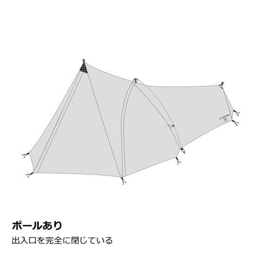 さらに専用DACポールを本体に付ければ居住空間を120%利用しながら自立型テントのような安定性が得られます。前後のガイラインループと前室一体型のフロントは利用シーンに応じた居住空間を作れます。