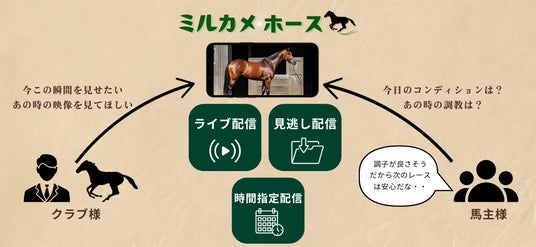 「ミルカメホース」は、遠隔地にいる馬主の方々をはじめ、一口馬主や出資者など、愛馬を見守りたいすべての方々を対象として開発されました。